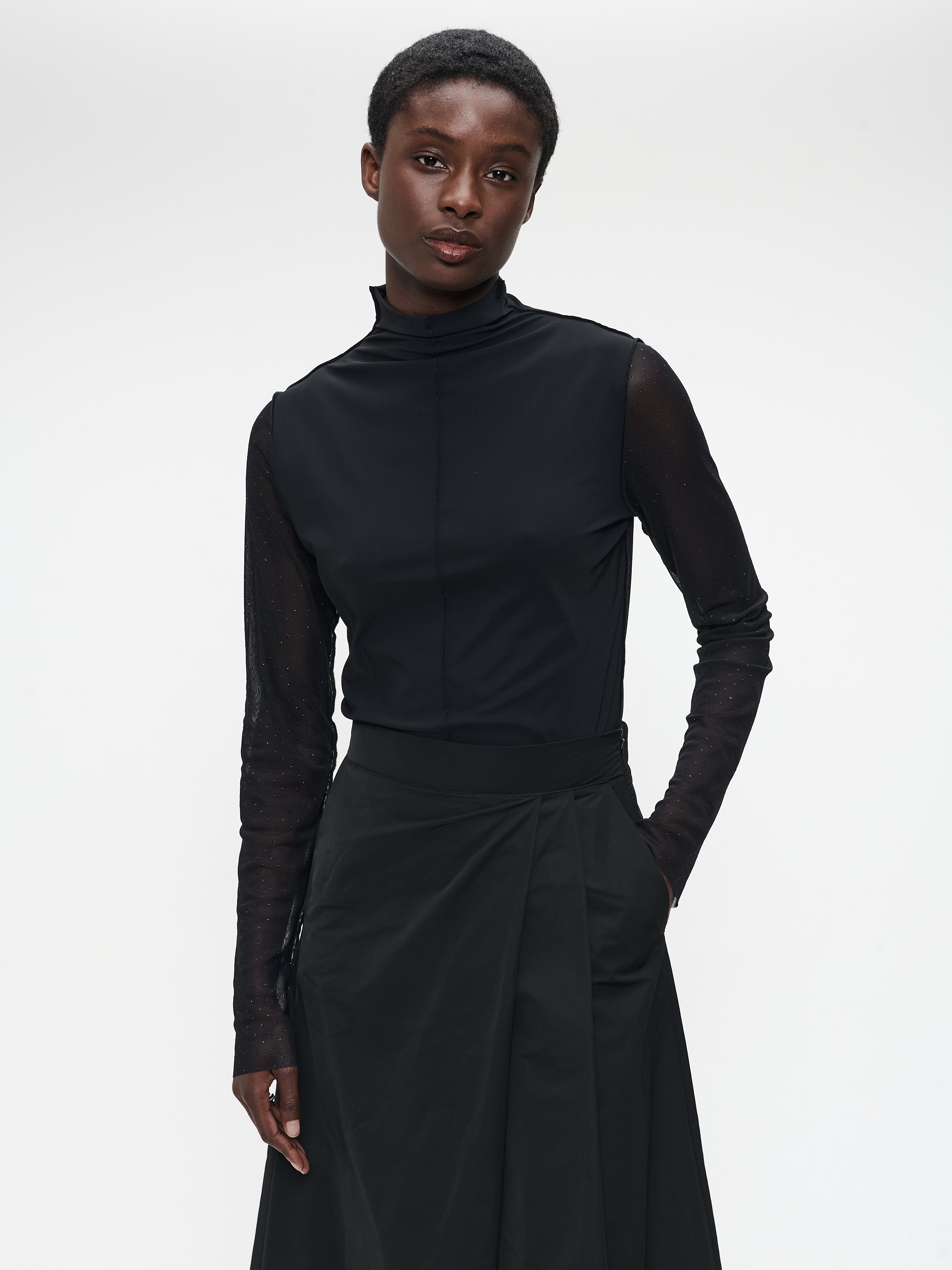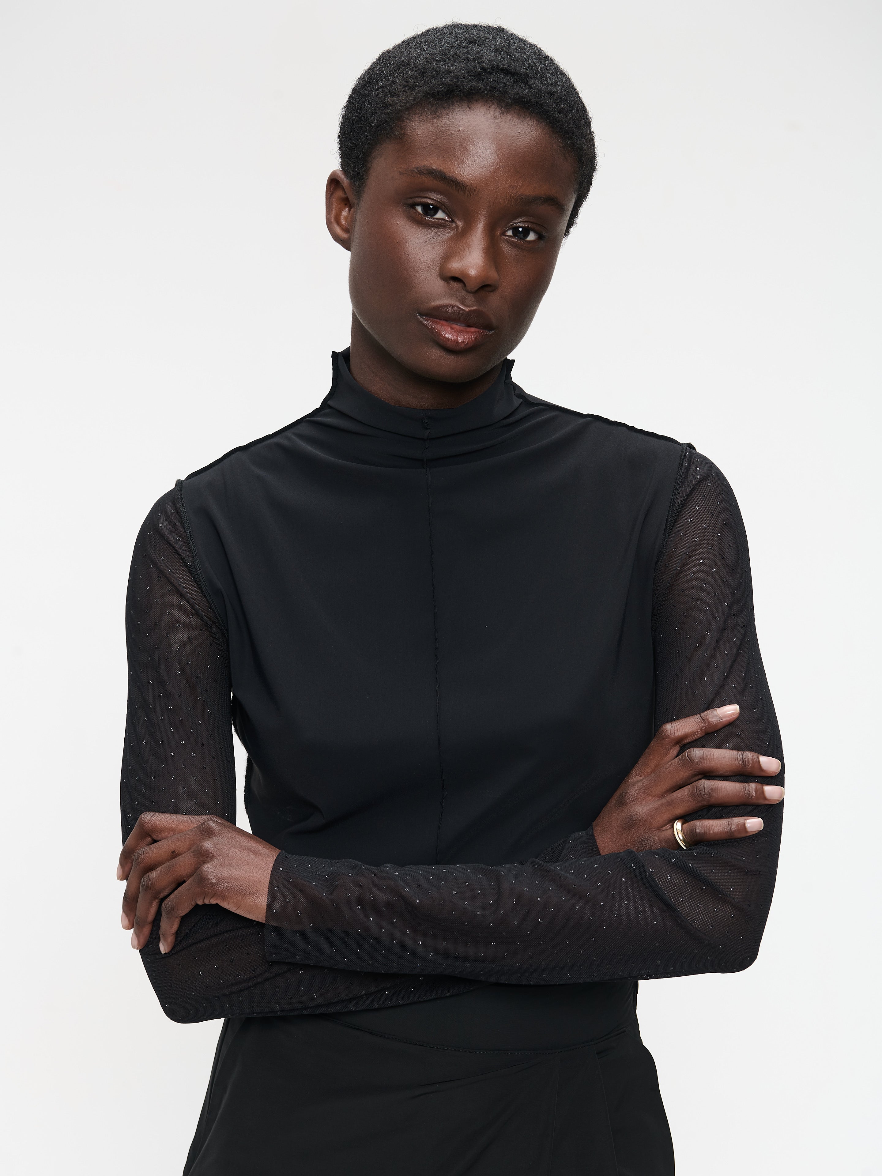 Raffiniert und ultramodern definiert das Zara Top Eleganz mit seiner schlanken Silhouette und luxuriösem technischem Jersey neu. Die halbtransparenten Ärmel verleihen dem strukturierten Stehkragen einen femininen Kontrast und machen es zu einem vielseitigen Stück, das mühelos vom Büro-Chic zur abendlichen Eleganz wechselt.