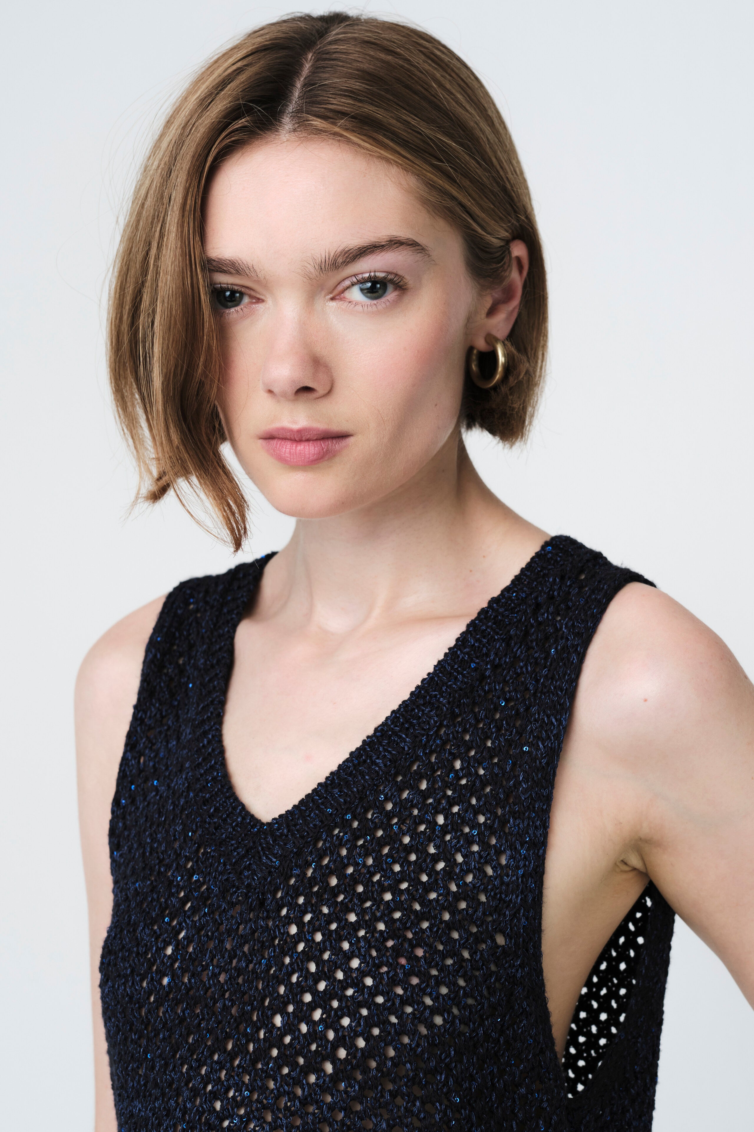 Das Openwork Knit with Sequins Top 90841 von Jane Lushka vereint lässige Raffinesse mit einem Hauch von Glamour. Hergestellt in Italien aus einer weichen, atmungsaktiven Mischung aus Polyester, Acryl und Baumwolle, besticht dieses ärmellose Top durch sein luftiges Ajour-Strickmuster mit feinen Pailletten, die sanft das Licht reflektieren. Der V-Ausschnitt und die entspannte Passform machen es zu einem stilvollen Begleiter für elegante Sommermomente.
