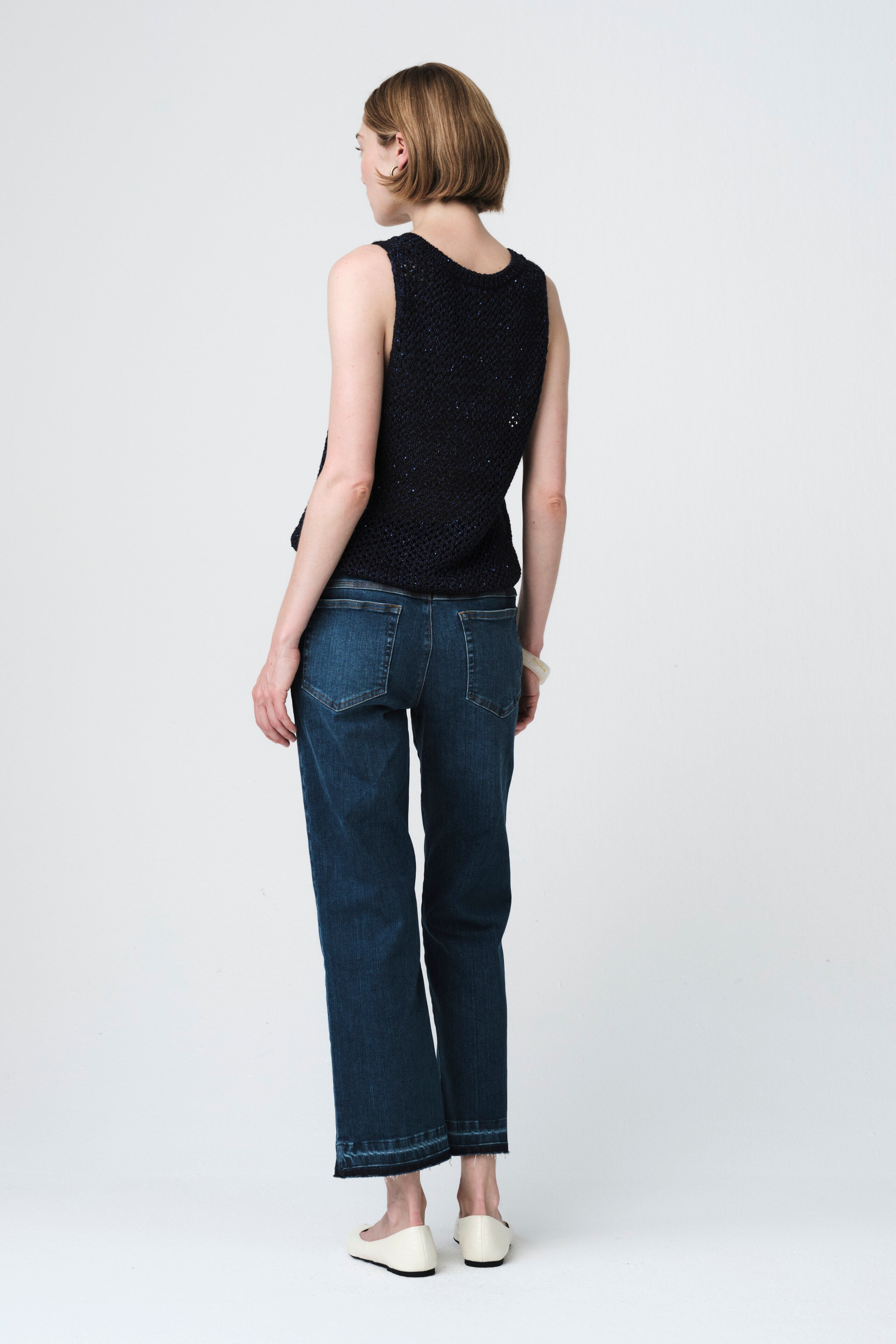 Die Openwork Knit Vest E24082 von Jane Lushka vereint handwerkliche Struktur mit moderner Schlichtheit. Gefertigt in Europa aus einer weichen Baumwoll-Acryl-Mischung, besticht sie durch ein feines Ajourmuster, das Leichtigkeit und Eleganz verleiht. Der runde Ausschnitt und die klassische Passform machen sie zu einem vielseitigen Sommer-Basic – perfekt kombiniert mit weiten Hosen oder Röcken.