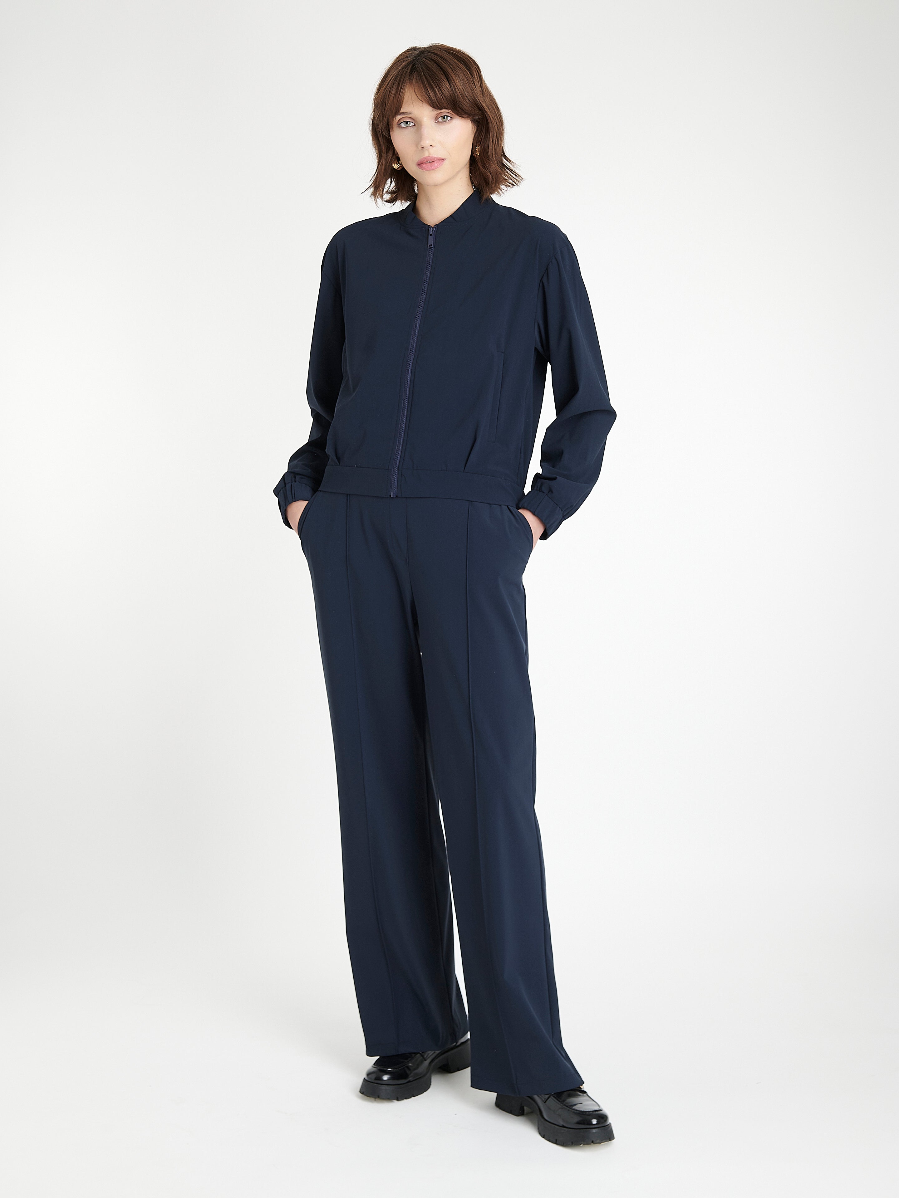 Die Thera Pants bieten eine raffinierte, fließende Silhouette – ideal für elegante Outfits mit hohem Tragekomfort. Aus gebürstetem technischem Jersey gefertigt, überzeugen sie mit weichem Fall, eleganten Falten vorne und weitem Bein. Perfekt kombinierbar mit Blazern oder Strickteilen für einen gehobenen Tages- bis Abendlook.