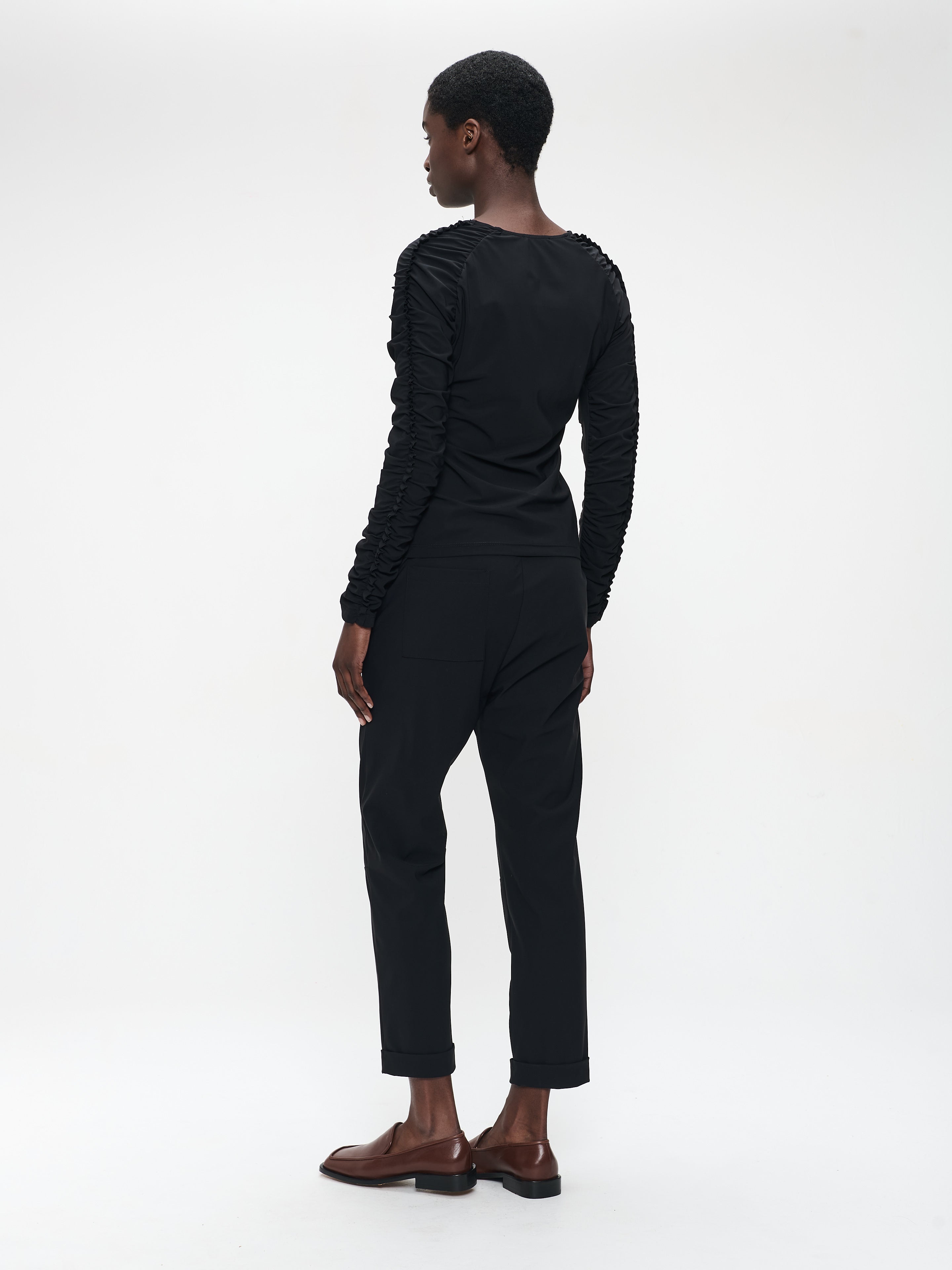 Die Leone-Bluse bietet ein elegantes Alltagsbasic mit einem Hauch von Struktur und Raffinesse. Hergestellt aus weichem technischem Jersey mit einem samtartigen gebürsteten Finish, besticht diese Bluse durch ihren architektonischen Kragen und klare Silhouette. Die lockere Form und die angesetzten Schultern sorgen für Komfort, während der skulpturale Ausschnitt für einen gepflegten Look sorgt – perfekt für Arbeit und Freizeit.