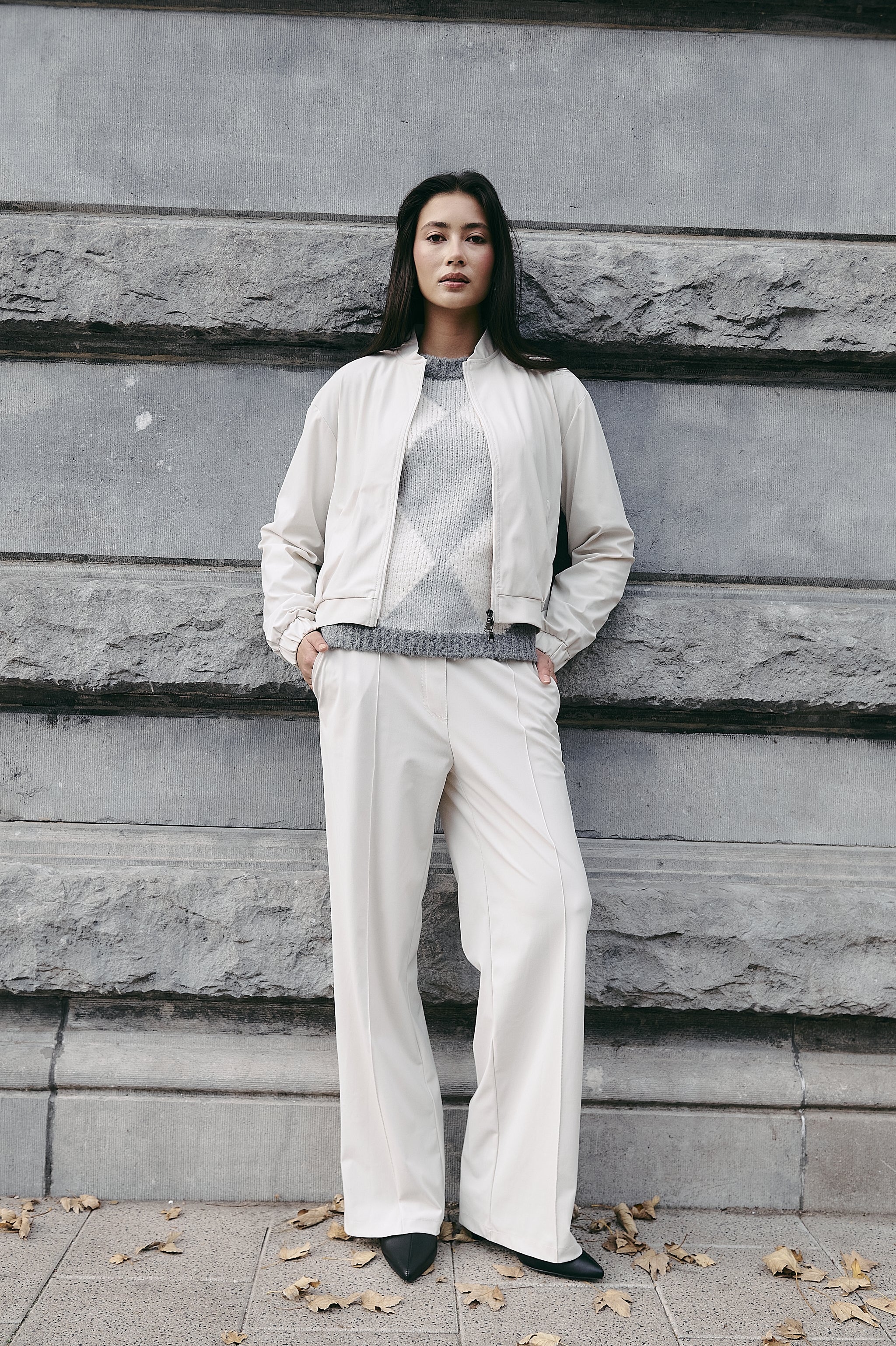 Aus gebürstetem Technical Jersey gefertigt, bietet sie eine weiche, leicht samtige Oberfläche, die luxuriös und funktional zugleich ist. Der minimalistische Kragen, der durchgehende Reißverschluss sowie elastische Bündchen sorgen für eine moderne, cleane Silhouette. Ob zur passenden Hose oder über ein Kleid getragen – Sharon verleiht jedem Outfit eine lässige Raffinesse.