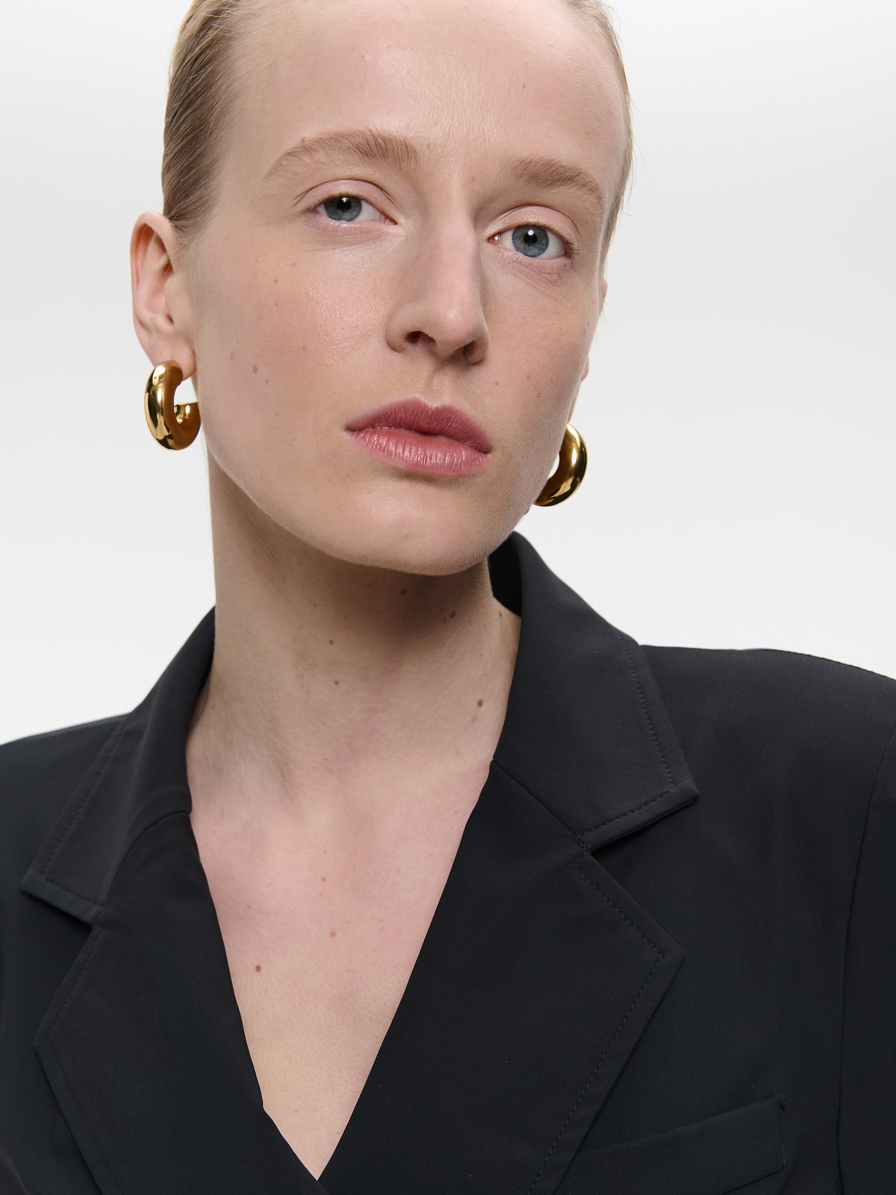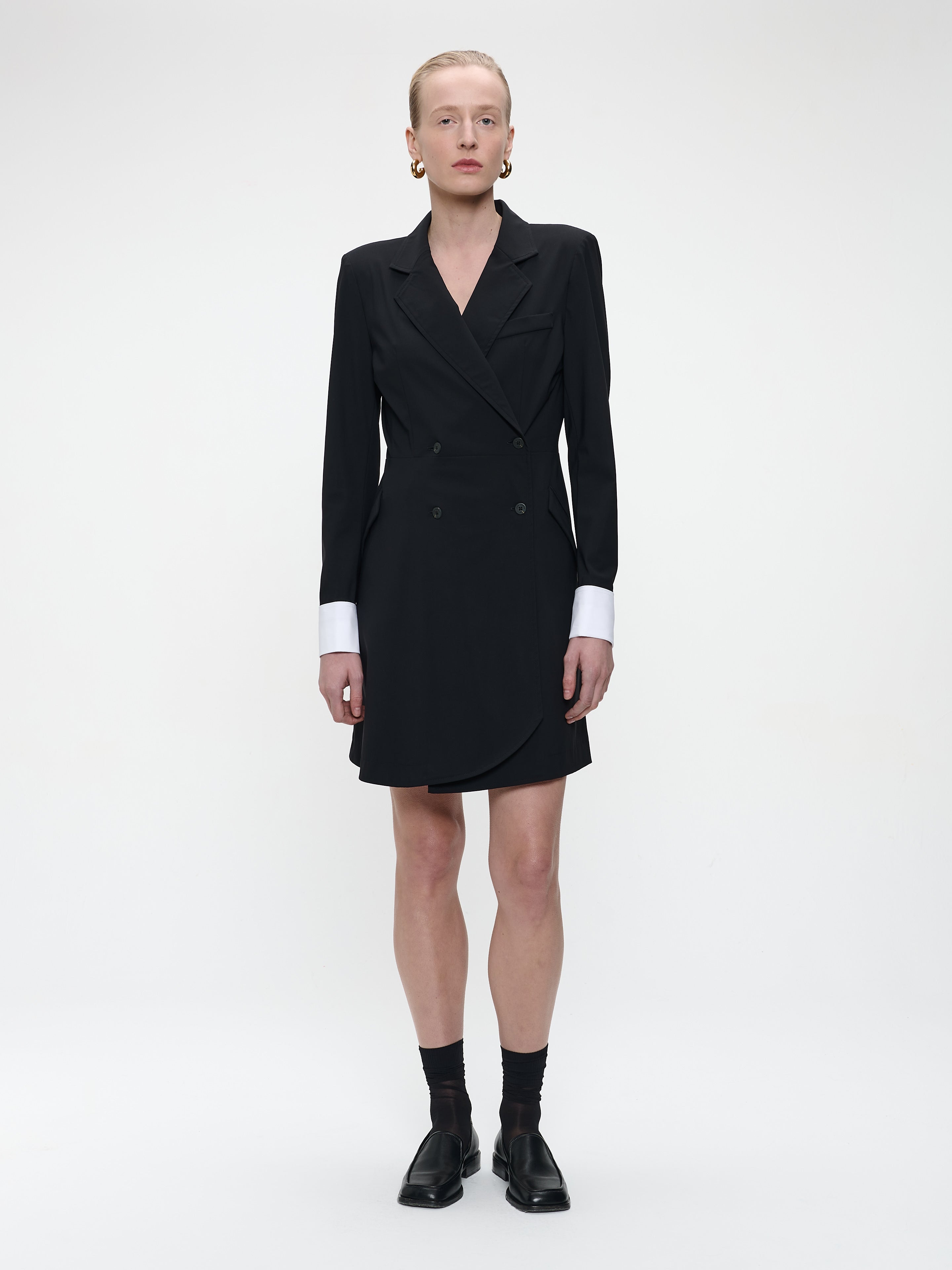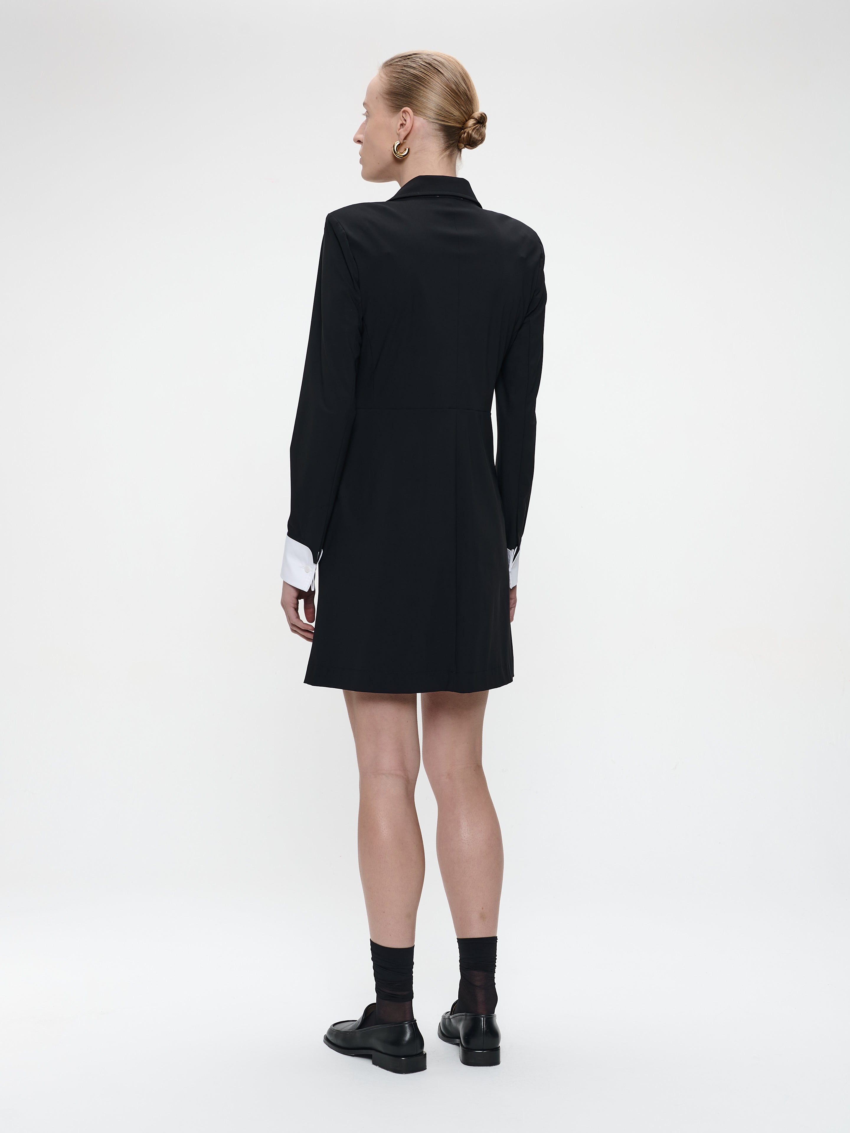 Das Hella Dress verbindet scharfe Schneiderkunst mit femininer Eleganz und interpretiert die klassische Blazer-Silhouette neu als mutiges, strukturiertes Kleidungsstück. Aus technischem Jersey gefertigt, verfügt es über eine doppelte Knopfleiste und kontrastierende weiße Manschetten, die das edle Erscheinungsbild unterstreichen. Der leicht ausgestellte Saum sorgt für Bewegung und mildert den strukturierten Look – ideal für selbstbewusste Auftritte im Büro und elegante Abende.