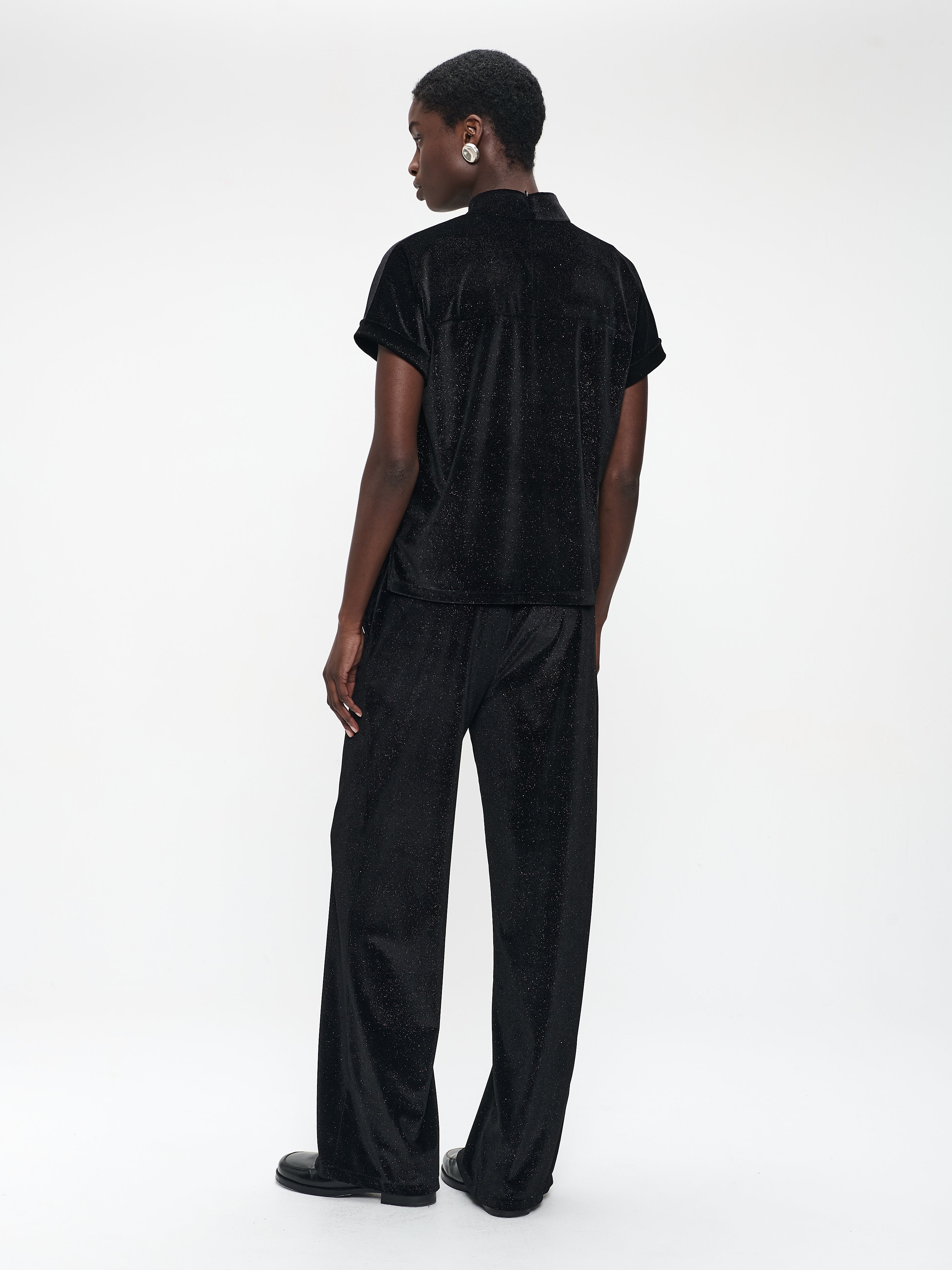 Die Simone Velvet Pants vereinen entspannte Eleganz mit moderner Leichtigkeit. Aus einem samtigen Stoff gefertigt, der jedem Outfit einen dezenten Glanz verleiht, überzeugen sie mit weitem Bein und elastischem Bund – ideal für stilvolle Alltagslooks oder elegante Abendauftritte.