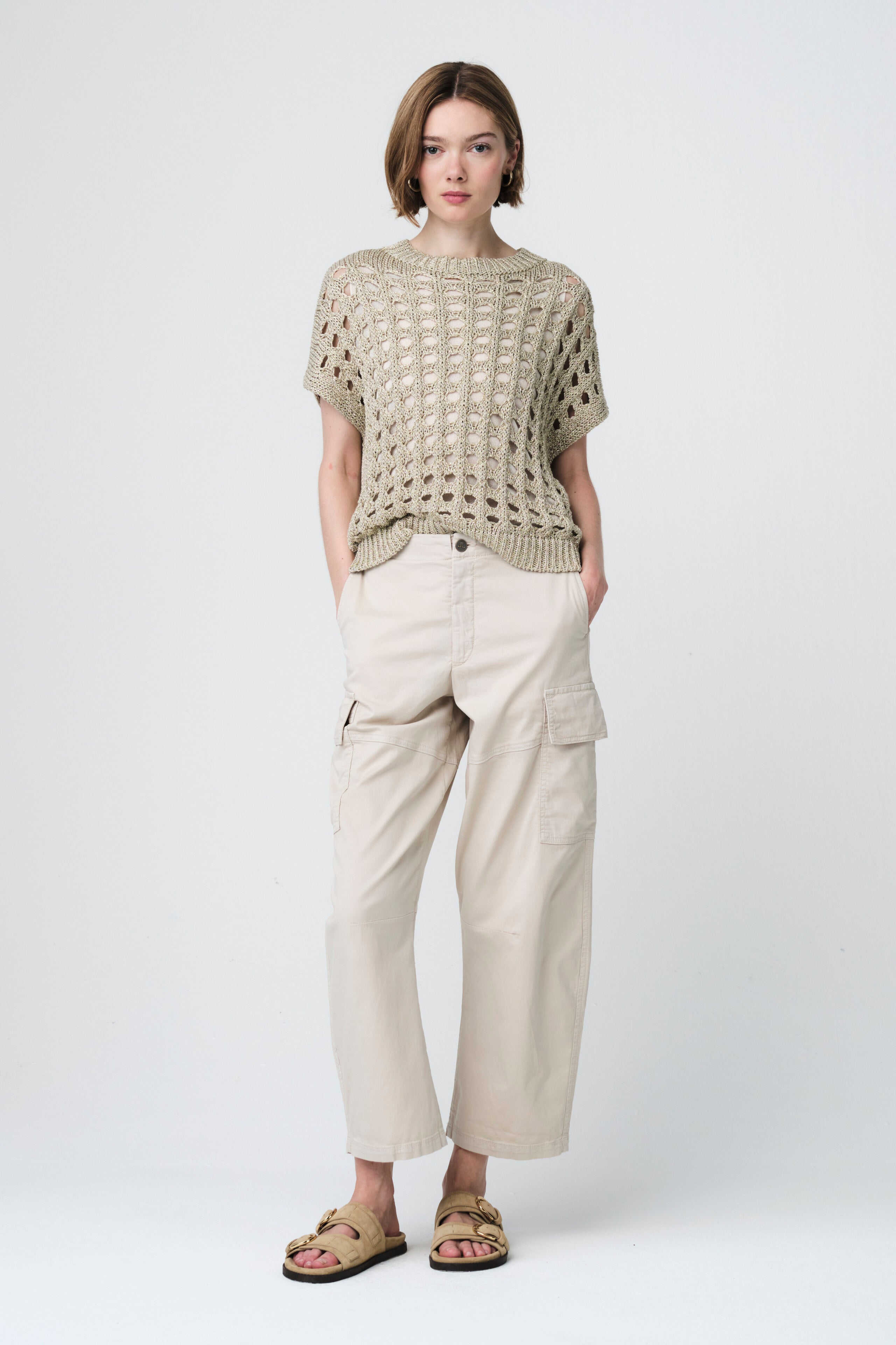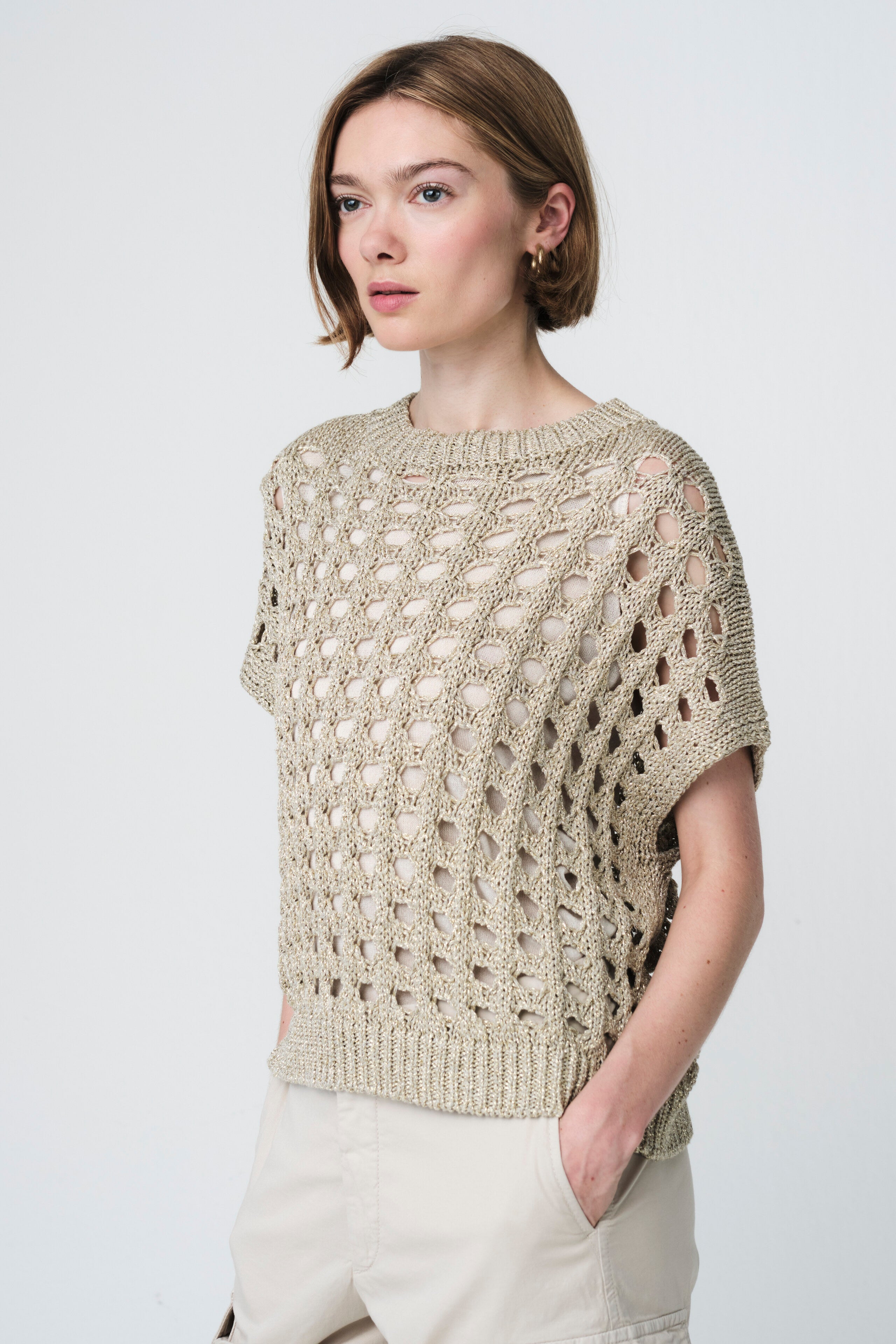 Die Viscose Gold Vest E26071 von Jane Lushka besticht durch dezente Eleganz. Hergestellt in Europa aus einer weichen Viskosemischung mit metallischen Fasern, beeindruckt sie mit einem offenen Strickmuster und sanftem Schimmer. Die lockere Passform sorgt für einen mühelos stilvollen Look – perfekt für warme Sommertage.